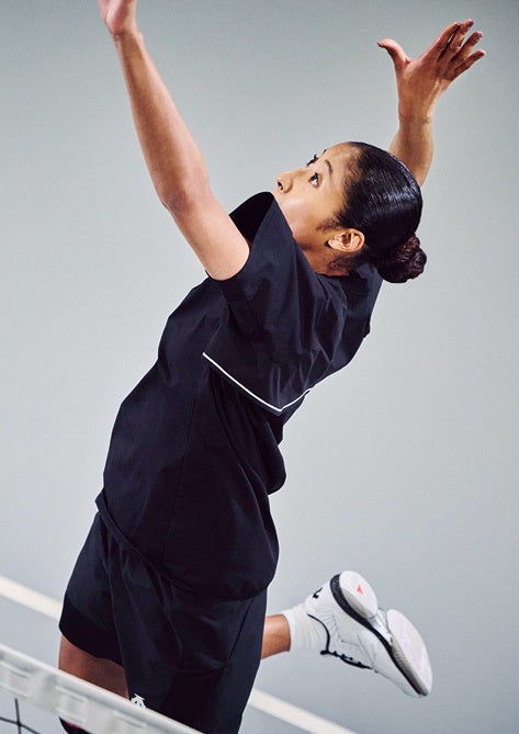 レシーブ、スパイク、ブロックといった全身を使ったプレーに集中できるよう、背中から脇下にかけて入った切り替えと伸縮性の高い素材を採用。