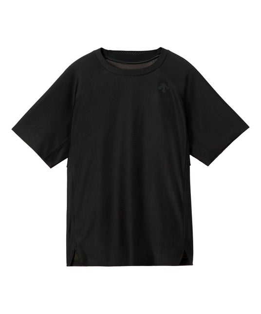 オリジナル素材の「Schematech AERO」ファブリックSchematech AEROファブリックは日本の生地メーカーと共に開発したオリジナル素材です。1枚の生地の中で部位ごとに機能変化をもたせる素材開発技術「Schematech」を活用し、ジャガード織りでメッシュ目の大きさを部位ごとに調整します。さらにデサント独自の発汗データ分析に基づく「スウェットマッピング理論」を用いて最適な部位に生地の通気性を高める工夫を施しています。