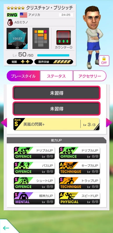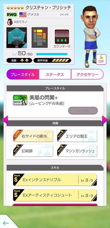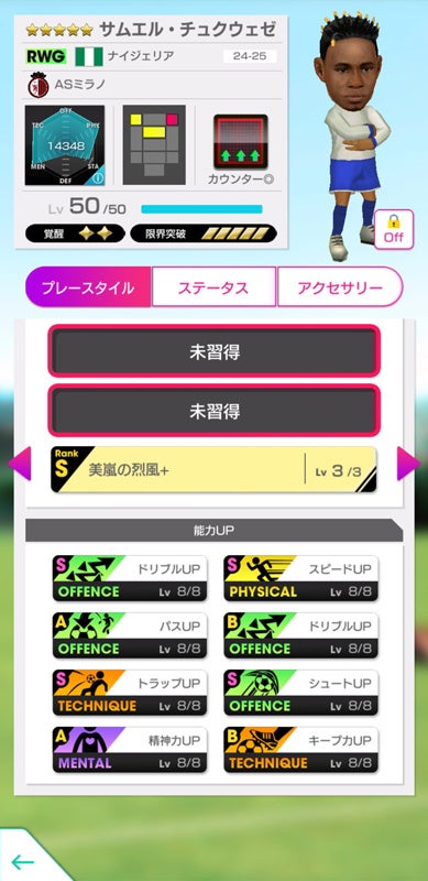 なお、今回獲得できる金アクセサリーをセットで装備すると、“「回復◎」ハーフタイムや延長戦開始時のスタミナ回復量が中アップします”“「精神力職人」精神力が中アップします”のコンボ効果が得られます。ぜひ獲得しましょう。