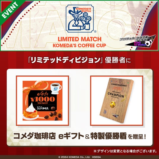 なお、 “LIMITED MATCH コメダ珈琲店 CUP”では、「リミテッドディビジョン」優勝者に「コメダ珈琲店×サカつくRTW特製表彰盾」&「コメダ珈琲店 eギフト1000円」をセットで贈呈します。どなたでもエントリーできますので、奮ってご参加ください!