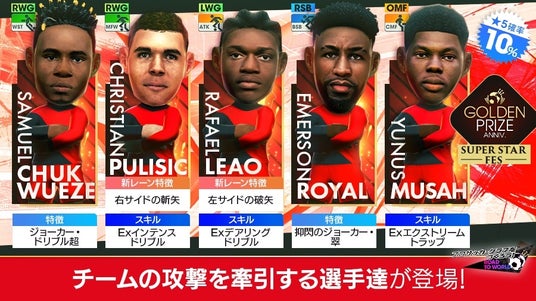 「ラファエル・レオン」「クリスチャン・プリシッチ」「エメルソン・ロイヤル」「サムエル・チュクウェゼ」「ユヌス・ムサ」といったイタリア強豪クラブの現役選手たちが、得意戦術カウンターの新★5選手として登場する“GOLDEN PRIZE Anniversary SUPER STAR FES”を開催! あわせて★4バージョンの選手たちがもらえる“スペシャルログインボーナス”も実施します。