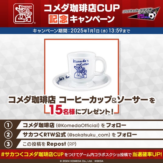“LIMITED MATCH コメダ珈琲店 CUP”開催を記念して、フォロー&リポストキャンペーンを実施中です。期間中、「コメダ珈琲店」公式 Xアカウント(@KomedaOfficial)と「サカつくRTW」公式 Xアカウント(@sakatsuku_com)をフォローのうえ、対象投稿( https://twitter.com/sakatsuku_com/status/1869306620569866695 )をリポストした方から抽選で15名様に、「コメダ珈琲店 コーヒーカップ&ソーサー」をプレゼントします。奮ってご参加ください。