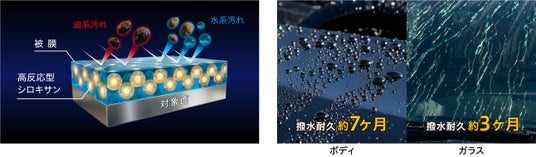プロコーティングにも採用される多様な「高反応型シロキサン」を贅沢に配合、ボディ・ガラスと反応し強固に結合することで、水玉がスルスルと滑落する高い撥水性能をボディ約7ヶ月※、ガラス約3ヶ月※の長期にわたって持続。ピッチやタールなどの油汚れも防止し、いつまでも愛車の美しい状態を維持します。
