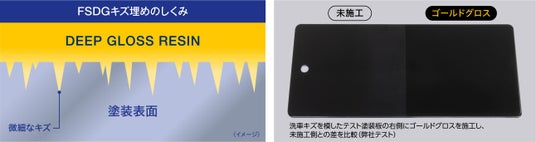 洗車キズなどボディ表面の微細なスクラッチを、極限まで深い艶出し効果を追求した新開発樹脂「DEEP GLOSS RESIN」で埋めるメカニズムで、艶・光沢性・スリック性をより引き上げます。