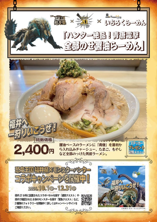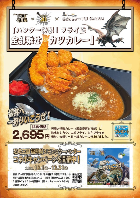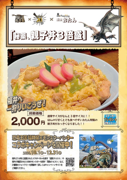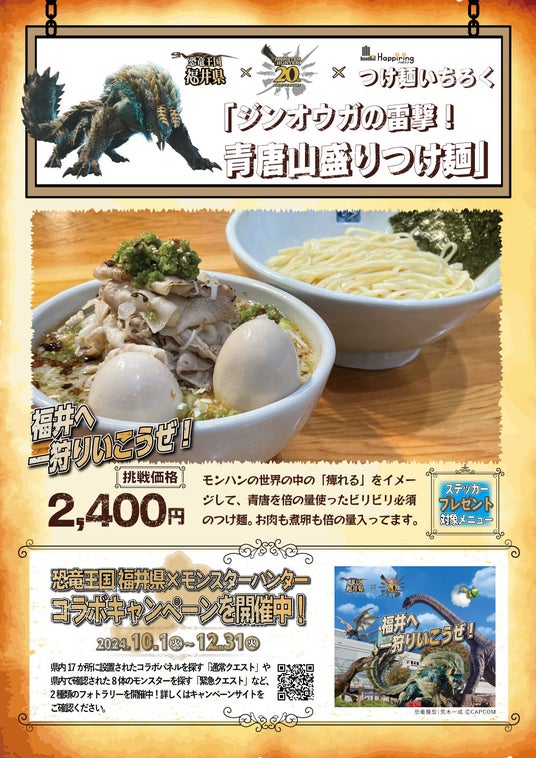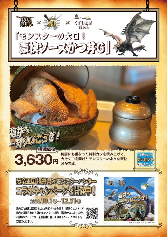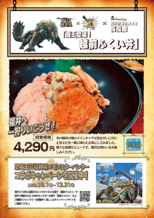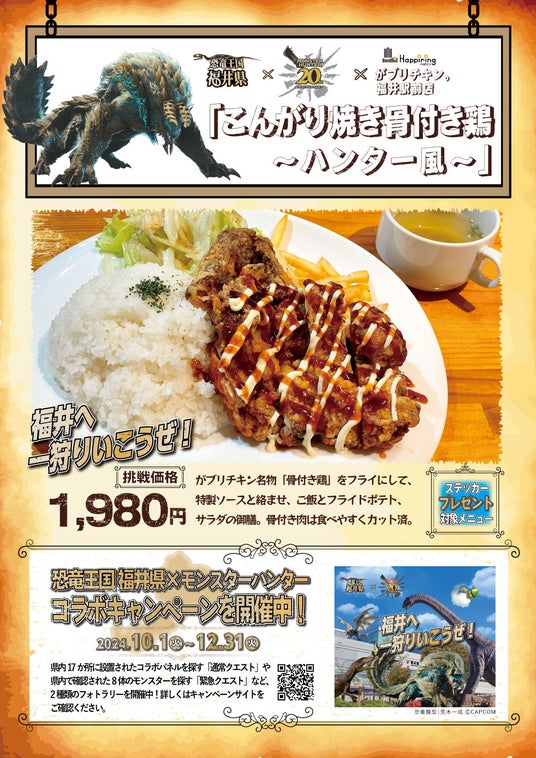 ハピリンモールテナント会(所在地:福井県福井市中央 会長 斎藤敏幸)は、北陸デスティネーションキャンペーンに合わせ、福井県が実施している株式会社カプコン(以下:カプコン)とのコラボキャンペーン「恐竜王国 福井県×モンスターハンター」の連動企画として『飲食店連携キャンペーン』を、2024年10月1日(火)~2024年12月31日(火)の期間で実施します。