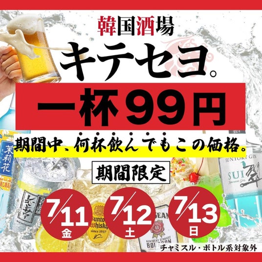 韓国風のネオンや看板などの雰囲気はそのままに、お仕事やゼミ・サークルの打ち上げでもご利用いただきやすいよう、今回新たにわいわい楽しめる団体席も誕生! 店内は完全分煙で、紙タバコ用の喫煙室の他、電子タバコ専用席もご用意し、様々なシーンでのご利用が可能です。 7月11日(金)~13日(日)の3日間は各種スタンダードドリンクを99円でご提供! リニューアルを記念して、7月11日(金)~13日(日)の3日間は各種スタンダードドリンクを何杯でも99円(税抜)でご提供! この機会に、ぜひキテセヨの自慢の料理と、日々の疲れをほっこり包む人の温かさに触れに来てください! 店舗情報 韓国酒場キテセヨ。 高田馬場店 営業時間: 日曜日~木・祝日:15:00~25:00 金、土、祝前日:15:00~29:00 〒169-0075 東京都新宿区高田馬場3-1-4 吾妻ビル地下1階 TEL:03-5937-2552 席数:57席 支払い:現金、クレジットカード 喫煙:分煙(電子タバコOK席、別途喫煙ルームあり)