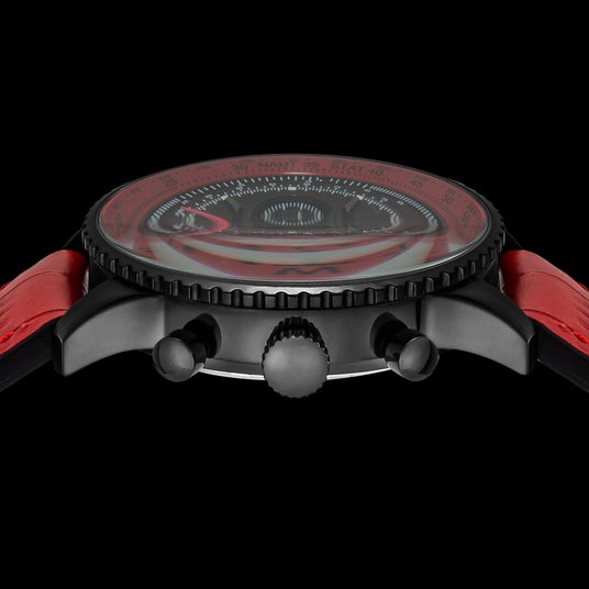 MFゴースト×ANGEL CLOVER 片桐夏向 TOYOTA 86GT モデル|NTS44MFG-TO|¥36,300(税込) 『MFゴースト』の主人公、片桐夏向が乗車する「TOYOTA 86GT」をイメージ。針やベゼル、ストラップ表面を車体と同じレッドカラーで表し、公道で疾駆する姿を彷彿とさせます。一方で、ケース全体は引き締まったマットブラックに。ダイヤル中央には格子状のパターンを取り入れ、「TOYOTA 86GT」の特徴的なフロントグリルを連想させます。12時位置に置かれた「86」も印象的です。 サブダイヤルから光を集めて駆動する日本製ソーラームーブメント「SEIKO EPSON VS75」を搭載し、フル充電すれば最大約6ヶ月間駆動します。 また、スクリュー式のケースバックには、「BLITZ」ロゴと、クルマのホイールを模したテクスチャーを刻印。後ろ姿からも、レースに挑む躍動感を漂わせます。 さらに、表にカーフレザー、裏にシリコンを圧着したハイブリッドストラップを採用。汗や水濡れに強く、手に汗を握るような状況でも安心して着用できます。