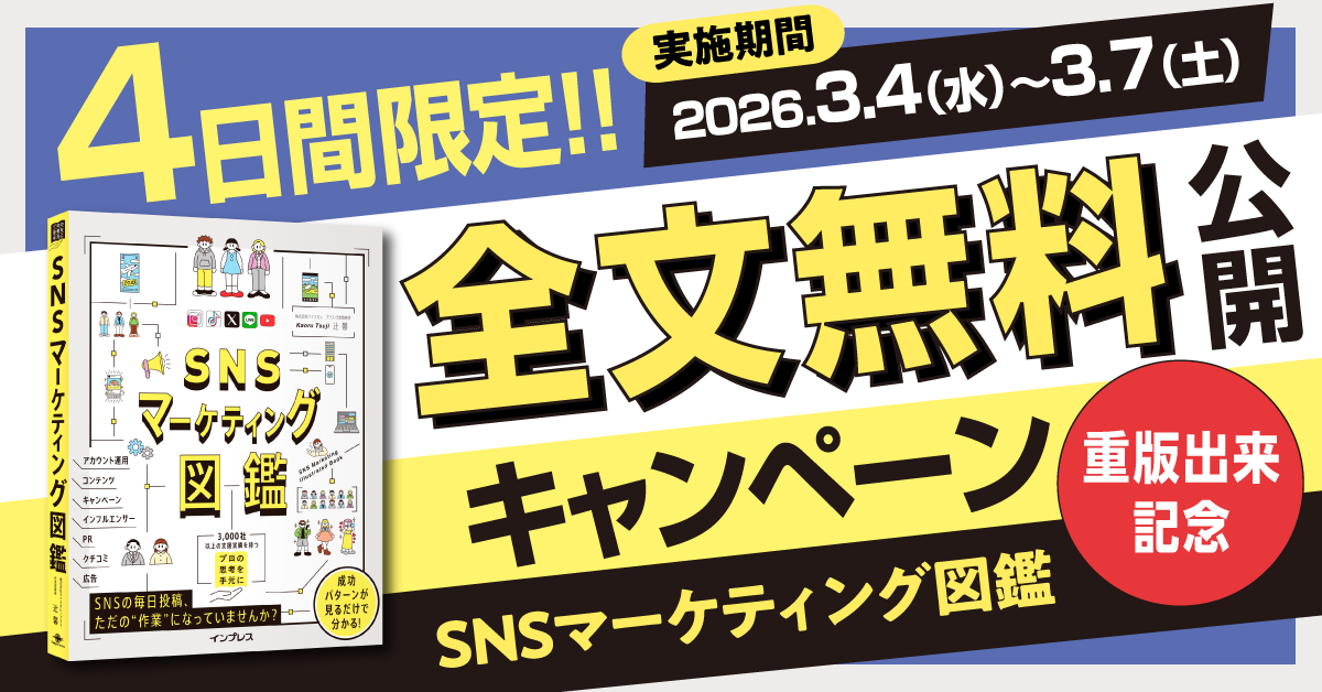 インプレスグループでIT関連メディア事業を展開する株式会社インプレス(本社:東京都千代田区、代表取締役社長:高橋隆志)は、書籍『SNSマーケティング図鑑』の重版出来を記念して、2026年3月4日(水)~3月7日(土)の4日間限定で全文無料公開キャンペーンを実施いたします。