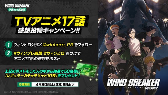 現在放送中のTVアニメ「WIND BREAKER Season 2」の感想にハッシュタグを付けてXに投稿することで、レギュラーガチャチケット10枚が当たるTVアニメ連動キャンペーンを毎週開催中です。