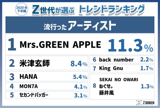 『Mrs. GREEN APPLE』が2023年下半期から連続1位で“Z世代の顔”に!「今日好き」で話題になった『MON7A』は“TikToker”と“アーティスト”の2部門でランクイン!
