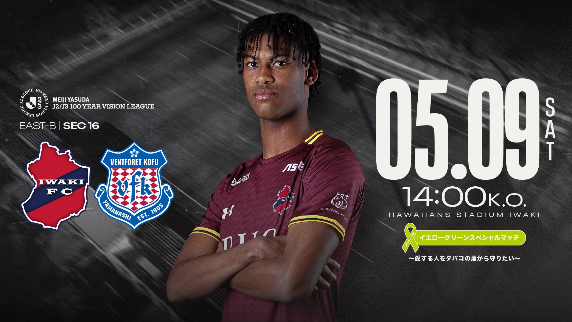 このたび、いわきFCは、5月9日(土)に開催される明治安田J2・J3百年構想リーグ 地域リーグラウンド EAST-B 第16節 ヴァンフォーレ甲府戦を「イエローグリーンスペシャルマッチ~愛する人をタバコの煙から守りたい~」として開催いたしますので、お知らせします。