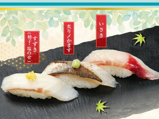 うまい鮨勘では、回転寿司店舗・ゆとろぎ店舗、東北対面寿司店舗それぞれの業態で、季節限定メニューを販売します。