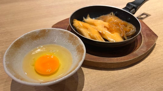 ちくわぶすき焼き仕立て鱧(ハモ)出汁を含んだちくわぶと白滝を割り下で焼いた意欲作!すき焼きのようにたまごで召し上がって下さい。