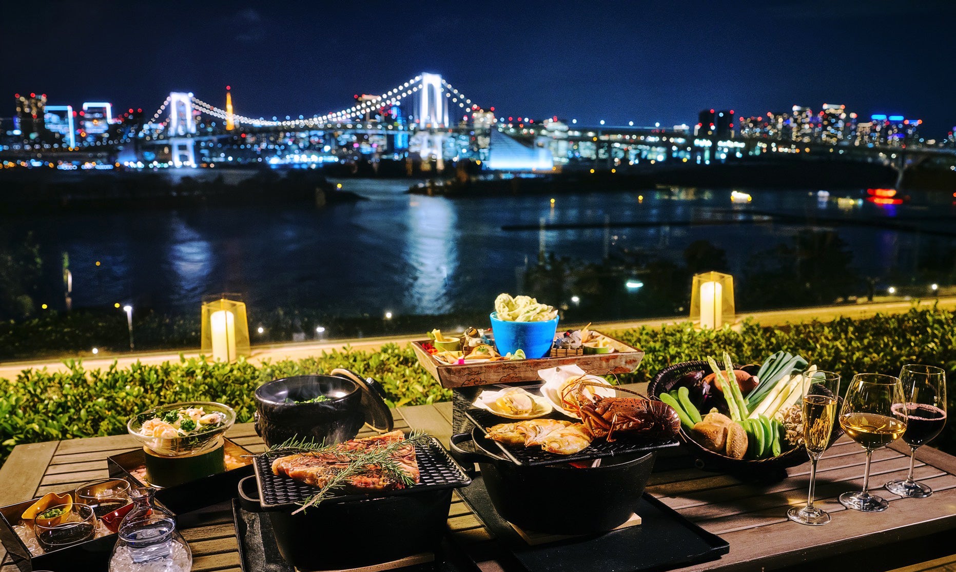 期間: 2026年3月29日(日)~10月31日(土) ※5月23日(土)・5月24日(日)・10月24日(土)は除外 場所: 日本料理「さくら」 テラススペース(3階) 時間: ランチ 11:30~15:00(最終入店 13:00)/ディナー 17:30~22:00(最終入店 20:00) ※ランチ・ディナータイム にて各6組様限定でのご提供 料金: お一人様 25,000円(税金・サービス料込) コース内容: 前菜:季節の和風オードブル盛り合わせ 海鮮(炭火焼):活伊勢海老、のどぐろの一夜干し、旬の活貝 肉料理(炭火焼):Tボーンステーキ 野菜(炭火焼):季節の新鮮野菜(盛り合わせ籠より お好みの3種をセレクト) お食事:季節の土鍋ご飯、一口稲庭うどん デザート: 桜香る白あんソース 甘味仕立て フリーフロー:スパークリングワイン、生ビール、ワイン(赤・白)、日本酒、ハイボール、ソフトドリンク各種 ※本プラン2名様でのシェアスタイルを基本としたコース構成のため、2名様単位でのご予約を承ります。(例:2名様、4名様、6名様でのご利用が可能) ※ご利用の3日前までにご予約ください。 ※天候や貸切営業などにより、テラス席のご案内をいたしかねる場合もございます。予めご了承ください。 ※メニュー内容は、季節により一部変更となります。 詳細・オンライン予約はこちら お問合せ・ご予約はTEL:03-5500-5580(10:00~20:00) お台場の夜景に「高さ150mの噴水」という新たな主役が加わる記念すべきタイミング。そのショーを、ヒルトンのテラスでシャンパン片手に眺めるなんて……まさに一生モノの記念日になりそうですね! 自分で焼き上げるスタイルも、会話が弾む素敵な演出。3日前までの予約必須かつ、ランチ・ディナー計12組という狭き門なので、特別な日の予約はお早めにどうぞ。■ヒルトン東京お台場について