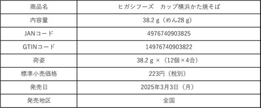 「ヒガシフーズ カップ横浜かた焼きそば」の発売日は2025年3月3日(月)となります。