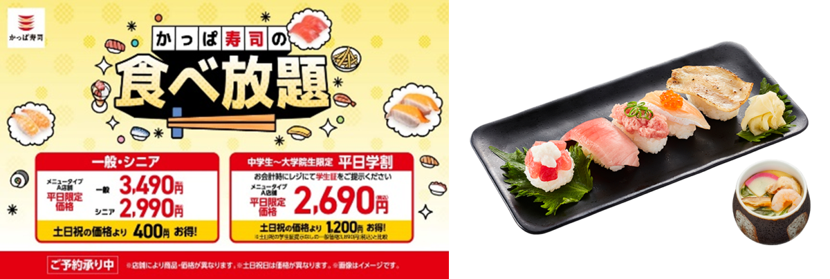 【かっぱ寿司の「食べ放題」+「平日価格」「平日学割」の概要】