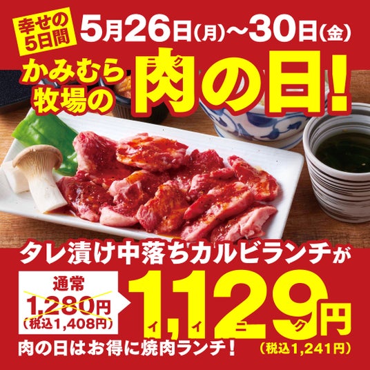 【かみむら牧場】「肉の日」企画スタート!5月26日から30日の5日間で、焼肉ランチのオススメ商品「タレ漬け中落ちカルビ」セットを1129(いい肉)価格で販売!