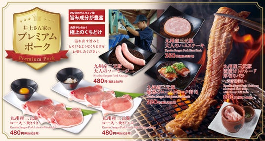 今回新登場する「井上さん家のプレミアムポーク」は、単品注文はもちろん、食べ放題コース「かみむら牧場コース」以上での注文も可能です。高品質な豚肉を、気軽に思う存分味わっていただける新たな体験をお届けします。 【井上さん家のプレミアムポークカテゴリーメニュー紹介】 九州産三元豚 ロース~焼きすき~ 480円(税込528円) 九州産三元豚 ロース~焼きしゃぶ~ 480円(税込528円) 九州産三元豚 大人のソーセージ 480円(税込528円) 九州産三元豚 大人のハムステーキ 350円(税込385円) 九州産三元豚 壺漬けトルネード厚切りバラ~青唐醤添え~ 680円(税込748円) 九州産三元豚 魅惑のローストポーク寿司 250円(税込275円)