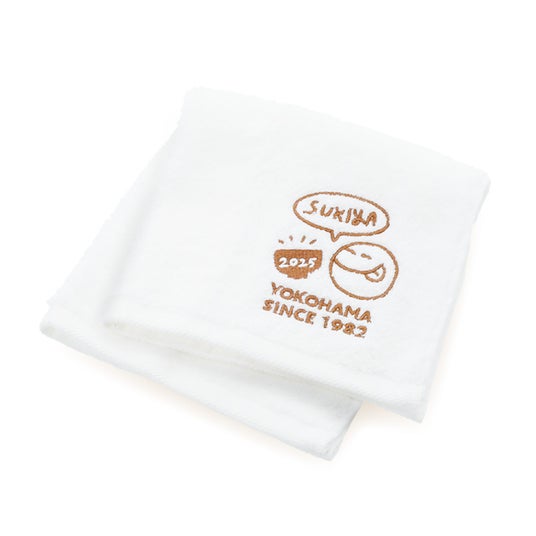 ふんわり柔らかな肌触りの、綿100%のハンドタオルです。すき家オリジナルのイラストがポイントのシンプルなデザインで、年中ご活用いただけます。