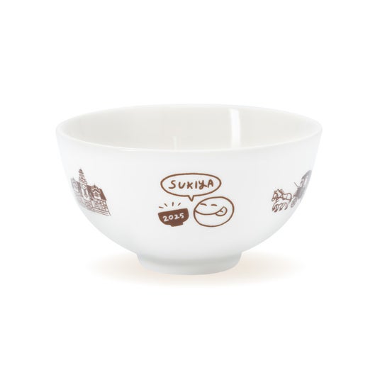 磁器製のお茶碗です。すき家発祥の地“横浜”をイメージしたイラストをあしらいました。電子レンジによる温めに対応しています。