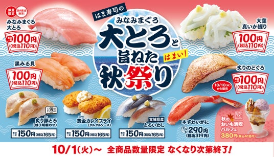 株式会社はま寿司(代表取締役社長:町野 岳 本社:東京都港区)が展開する100円寿司チェーン「はま寿司」は、10月1日(火)より、脂がのったとろけるような味わいの「みなみまぐろ大とろ」を100円(税込110円)でお楽しみいただける「はま寿司のみなみまぐろ大とろと旨ねた秋祭り」を全国の店舗で開催します。