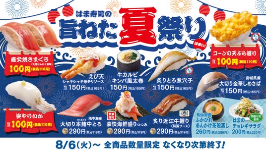 株式会社はま寿司(代表取締役社長:町野 岳 本社:東京都港区)が展開する100円寿司チェーン「はま寿司」は、8月6日(火)から「はま寿司の旨ねた夏祭り」を全国の店舗で開催します。