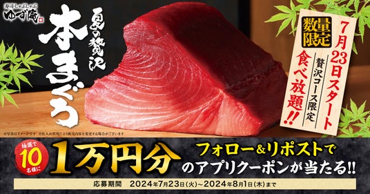 株式会社物語コーポレーション(本社:愛知県豊橋市/代表取締役社長:加藤 央之)が全国97店舗展開する『寿司・しゃぶしゃぶ ゆず庵』(以下、ゆず庵)は、「夏の贅沢 本まぐろ」の販売を記念して、公式X(旧Twitter)にてゆず庵アプリクーポン1万円分が当たるプレゼントキャンペーンを開催いたします。