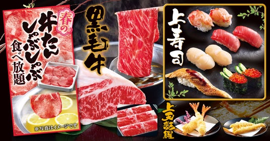 牛たんや黒毛牛のしゃぶしゃぶをはじめ、上寿司の「中とろ握り」、「特大炙り上穴子握り」など、およそ120品を超えるメニューが食べ放題でお楽しみいただけます。