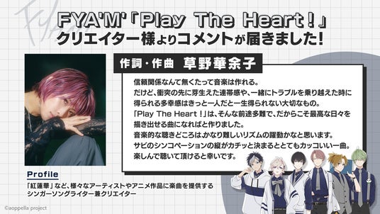 FYA’M’による新しいオリジナル楽曲「Play The Heart!」は、「紅蓮華」など、様々なアーティストやアニメ作品に楽曲を提供するシンガーソングライター『草野華余子』様が制作。