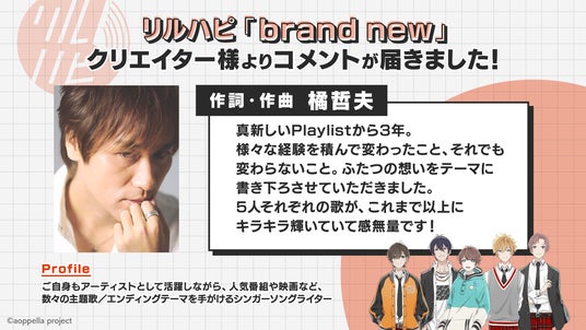リルハピによる新しいオリジナル楽曲「brand new」は、ご自身もアーティストとして活躍しながら、人気番組や映画など、数々の主題歌/エンディングテーマを手がけるシンガーソングライター『橘哲夫』様が制作。