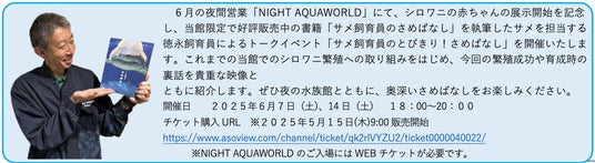 展示水槽近くには、誕生時の体重を体感できるぬいぐるみなどを設置した、赤ちゃん誕生記念ブースも登場します。 今回の赤ちゃんは、一時、浮力不足による遊泳不良な症状に陥りましたが、これまでの経験を活かした飼育員による胃内への空気注入処置により回復し、元気に泳ぐようになりました。産まれて間もないシロワニに空気注入を施し、回復させた例は世界的にも前例がありません。また照明に過敏に反応するなどの神経質な面も見られましたが、周辺の光を遮るなど工夫をして、徐々に環境に慣れさせることができました。苦難を乗り越え、元気に展示水槽へデビューした赤ちゃんの今後の成長を温かく見守ってください。