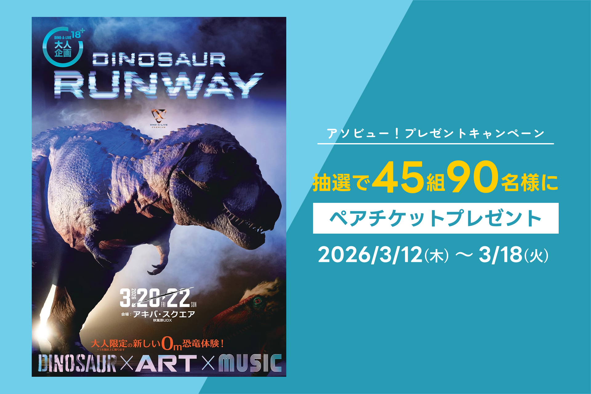 休日の便利でお得な遊び予約サービス「アソビュー!」(URL:https://app.adjust.com/138x1dst、以下:アソビュー!)を運営するアソビュー株式会社(所在地:東京都品川区、代表執行役員CEO:山野智久、以下:当社)は、「DINOSAUR RUNWAY <ペアチケット>」が抽選で45組90名様に当たるプレゼントキャンペーンを、2026年3月12日(木)より開始します。 「DINOSAUR RUNWAY」は2026年3月20日(金・祝)~3月22日(金)の3日間、秋葉原UDX 2階 アキバ・スクエアで開催されます。「大人のディノアライブファンの皆様へ存分にリアルな恐竜体験をしていただく」ことをテーマに、アーティスティックな映像と感情を揺さぶる音楽、恐竜たちの生きる姿を間近でご堪能いただけるライブパフォーマンス、そしてディノアライブ初、ドリンクを片手にご観覧できる新感覚の恐竜ライブショーなどが体験できる構成となっており、子供の頃の興奮と好奇心が蘇る、世界に類のない驚きの体験があなたを待っている特別な恐竜ライブショーです。