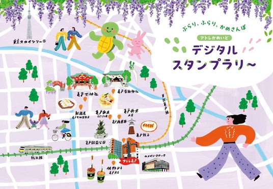 期間中、アトレ亀戸オリジナルの「かめいどさんぽマップ」を使い、亀戸天神社や亀戸香取神社をはじめとした名所や、くず餅で知られる船橋屋など、亀戸にゆかりのあるお店を巡るデジタルスタンプラリーを開催します。また、アトレ亀戸公式キャラクターのカメレちゃんによる亀戸天神社でのグリーティングや、アトレ亀戸がおすすめする、亀戸に遊びに来たら買うべき亀戸土産を展開し、亀戸の街とアトレ亀戸が一体となって亀戸天神社の藤まつりと街を盛り上げます。