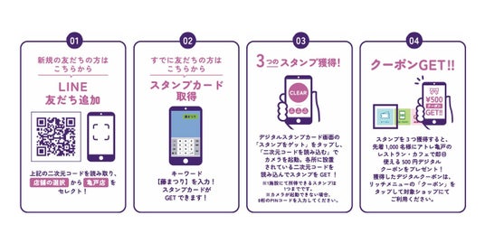 アトレ公式LINEでアトレ亀戸をよく行く店舗に設定した方に、デジタルスタンプラリーの台紙を配信。各施設に設置してある二次元コードをカメラで読み込むと、デジタルスタンプを集めることができます。スタンプを3つ集めた先着1,000名様に、アトレ亀戸のレストラン、カフェで使える500円デジタル