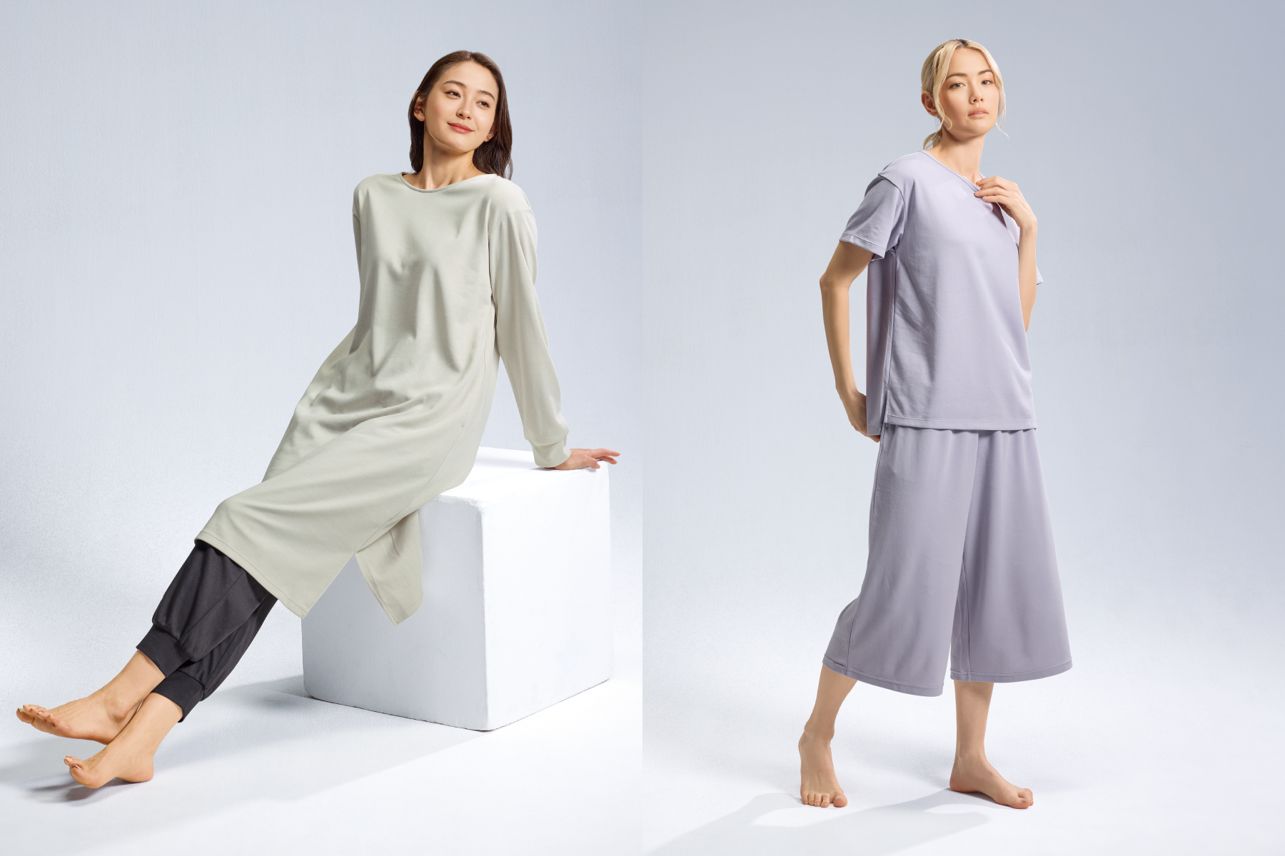 今回新登場するレディースアイテムでは、チュニックや8分丈ワイドパンツ、ドロップショルダーを採用した半袖Tシャツなどをラインナップ。ラベンダーやセピアなどのやわらかな色味を取り入れ、リラックスシーンにもなじむデザインに仕上げ、やわらかい雰囲気を演出しています。