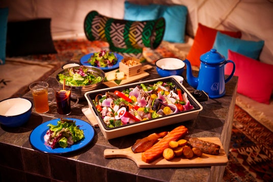「Nordisk」のテントで楽しむ冬のアウトドアディナー1日1組限定の特別な空間で、シェフが厳選した20種類の旬の野菜をたっぷりと使用したブイヤベース鍋をお楽しみいただけます。インテリア雑貨で人気の「BRUNO」と、ライフスタイル提案企業「CCC」のアウトドアプロジェクト「CCC OUTDOOR LAB」が共同開発した限定コラボモデル「FLAT HOT PLATE」を使用し、新鮮な野菜の甘みと魚介の旨味が溶け込んだスープは絶妙なバランスを生み出します。一口ごとに素材本来の風味が広がり、冬の夜風を感じながら鍋の温かさが身体を芯から温め、心までリラックスさせてくれる特別な時間が流れます。