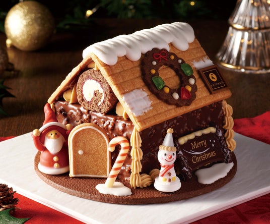 チョコレートケーキでつくられた、サンタのお菓子のお家へようこそ!チョコアーモンドスポンジとコクのあるバタークリームを8層に重ねた、カラメルが香るチョコレートケーキに、小さなブッシュドノエルや、クッキーの屋根をのせました。すべて食べられるスイートなお家を囲んで、すてきなパーティーを。