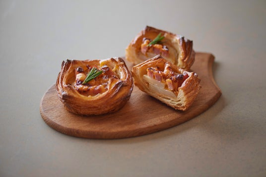 「厚切りベーコンとじゃがいものデニッシュ」 デニッシュ生地に、北海道産の皮付きじゃがいもと乾塩ベーコンを重ね、マスタードソース、チェダーチーズをトッピング。