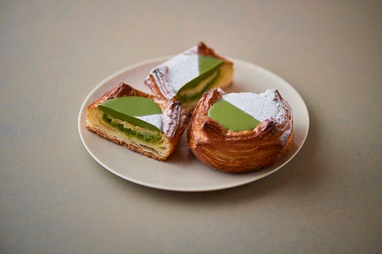 「抹茶デニッシュ」 デニッシュ生地に、抹茶アーモンドクリーム、カスタードクリームを重ねて焼き上げ、抹茶チョコレートを流して粉糖で仕上げました。