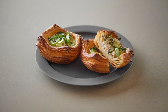 「九条ねぎとゆず胡椒チキンのデニッシュ」 デニッシュ生地に、ゆず胡椒マヨと合わせたチキン、九条ねぎを重ねて焼き上げました。