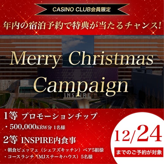 株式会社INSPIRE VIP CASINO CLUB(本社:東京都目黒区)は、2024年11月1日より「Merry Christmas Campaign」を開催いたします。本キャンペーンの開催期間中に、カジノクラブを通じてインスパイアホテルへの宿泊予約を完了いただいた方には、自動でエントリーをさせていただきます。