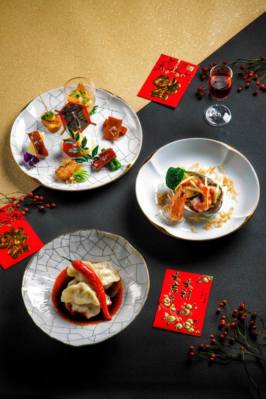 ランチ・ディナーともに、焼き物入りの迎春前菜から始まり、「釜焼き北京ダック」や、“余”と“魚”の発音が似ていることから豊かさの象徴とされる旧正月の代表的な料理「魚の香港葱生姜蒸し」、お米を中心とした五穀(米・麦・キビ・アワ・豆)で作る「干し肉入り五目おこわ」など、縁起が良いとされる伝統食材をふんだんに使った料理の数々が並びます。ディナーコースでは、“ひれ”が鳥の羽の様に広がる「高級乾物 魚のひれ姿煮」や「活きエビとアワビの炒め」など、贅沢な食材を堪能する伝統的な広東料理をお楽しみいただけます。