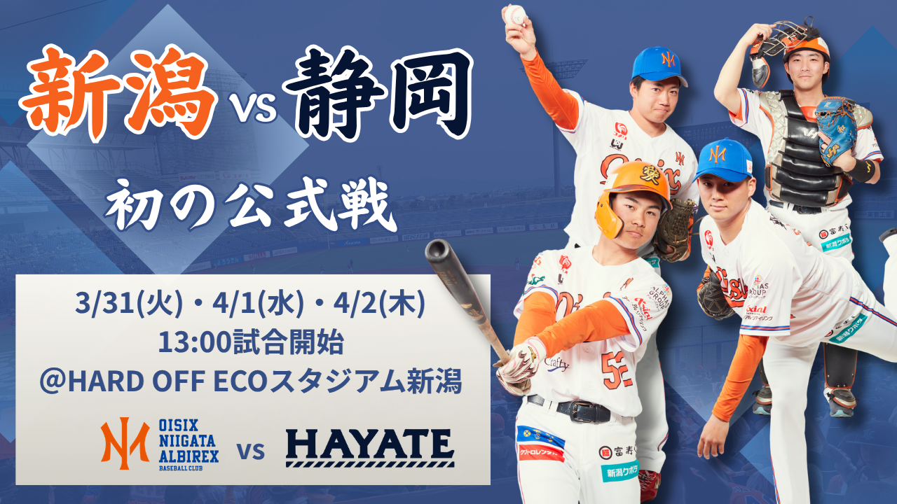 オイシックス新潟アルビレックス・ベースボール・クラブは、3月31日・4月1日・4月2日の3試合で、ハヤテベンチャーズ静岡とのファーム・リーグ交流戦を行います。