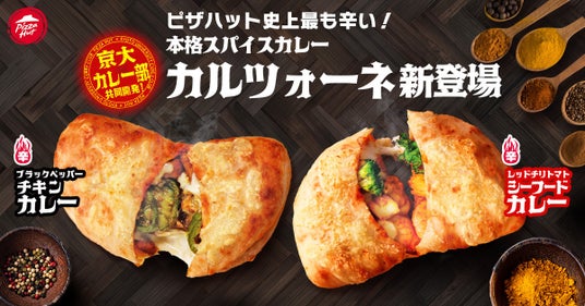 2024年7月22日(月)~8月25日(日)までの期間限定・数量限定で再販を決定することが決定した「京大カレー部共同開発!本格スパイスカレーあいがけピザ」「ブラックペッパーチキンカレーピザ」「レッドチリトマトシーフードカレーピザ」「Hut Melts 本格スパイスカレー(チキン&シーフード)」の4商品に、新登場の「【カルツォーネ】ブラックペッパーチキンカレー」「【カルツォーネ】レッドチリトマトシーフードカレー」の2商品を加えた、合計6商品の京大カレー部とのコラボメニューを販売いたします。再登場の4商品はもちろん新登場の2商品は、ピザ屋の技術を注いだ製法で作っており、こだわりのスパイスカレーとチーズを包み込み、高温のピザオーブンでジュワッと焼くことで「揚げていないのにジューシー」といった他では味わえない最高のカレーパン(カルツォーネ)に仕上がっています。