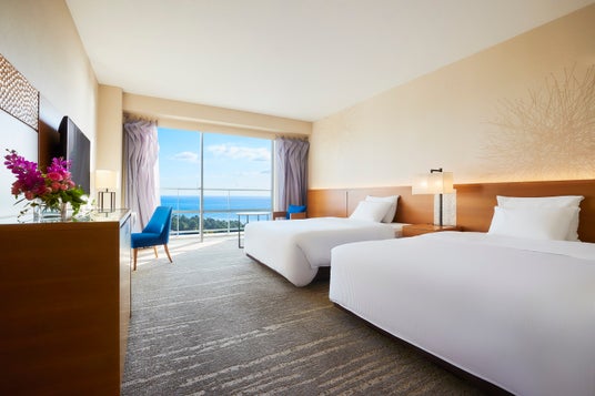グランドニッコー淡路では、窓の外の景色に溶け込むようなリゾート感あふれるお部屋をご用意しています。なかでも隣り合う2室を室内のドアでつなぐコネクティングタイプのデラックスルームは、お部屋の外に出ることなく行き来が可能で、ご友人同士グループでのご滞在の際にもゆったりとお寛ぎいただけます。