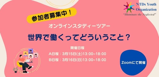一般社団法人NTDs Youthの会(事務所:福岡市博多区、代表理事:轟木亮太)は、若年層におけるグローバルヘルス分野への関心を高め、将来の選択肢を広げることを目的として、オンラインイベント「オンラインスタディーツアー~世界で働くってどういうこと?~」を開催いたします。