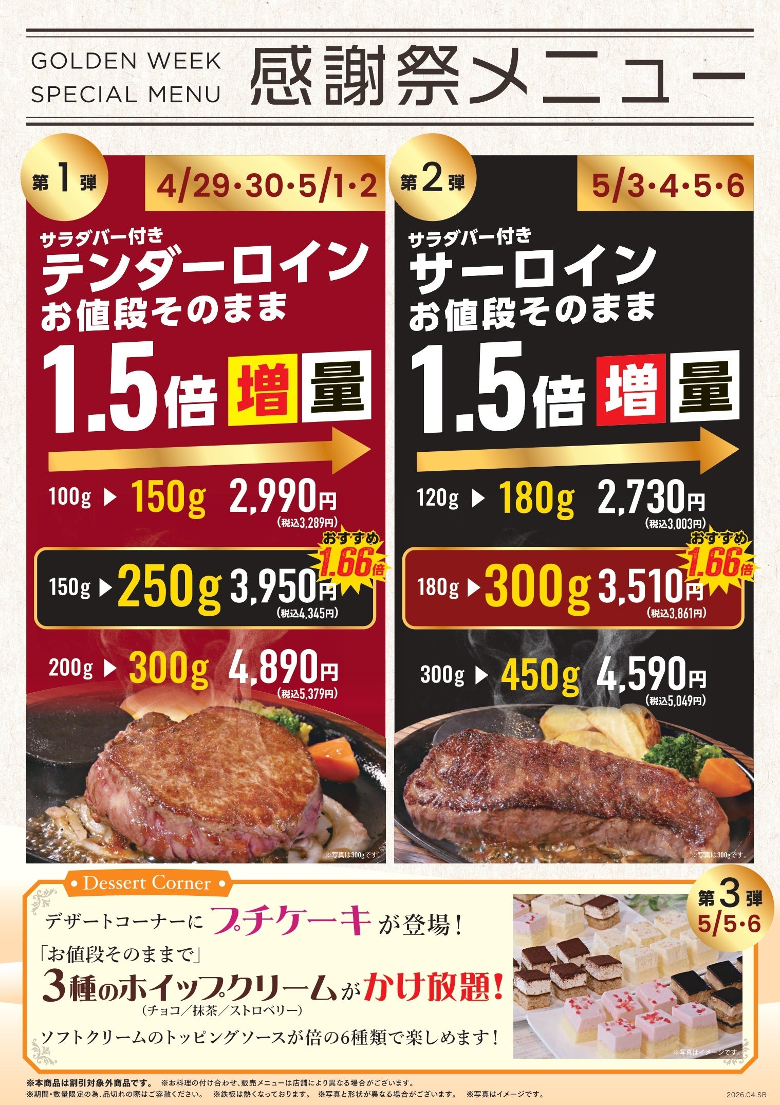 期間中は、第1弾・第2弾・第3弾に分けて、人気ステーキの増量企画や、デザートコーナーでお楽しみいただける特別企画をご用意いたしました。