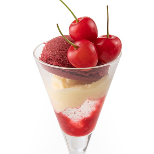 さくらんぼの香りを感じる店内製造シャーベットとチェリーソース、コアントローゼリー、ディプロマットクリームを重ねたパフェです。