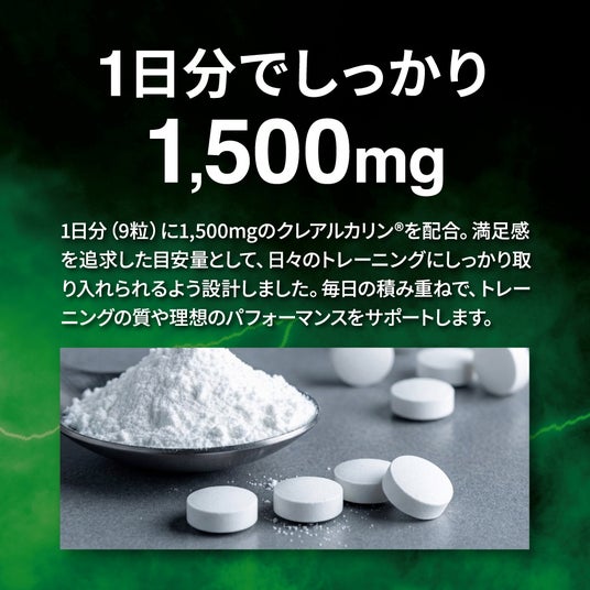 1日分(9粒)に1,500mgのクレアルカリンを配合。満足感を追求した目安量として、日々のトレーニングにしっかり取り入れられるよう設計しました。