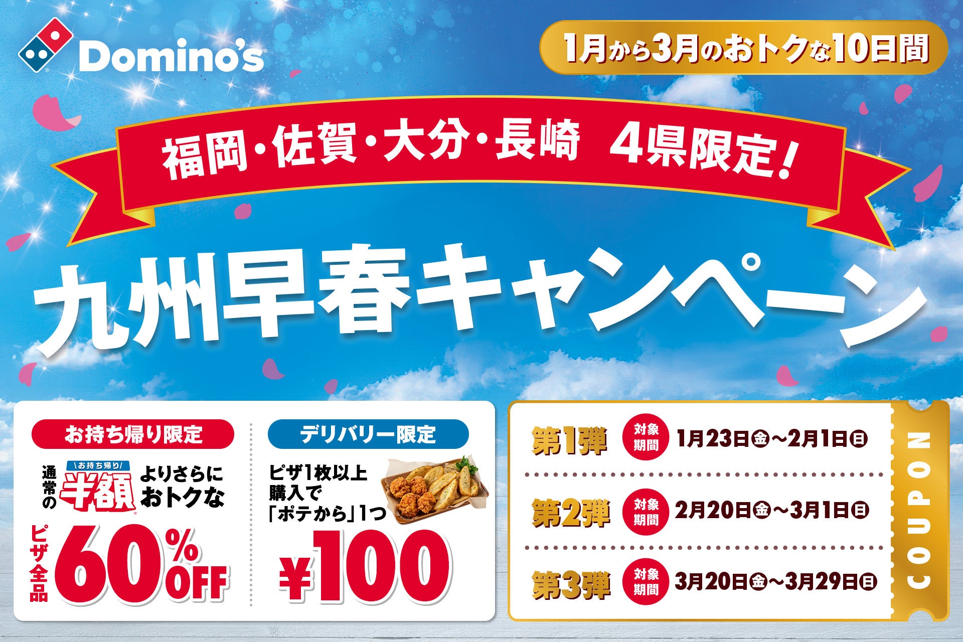 【ドミノ本気】九州限定で「ピザ全品60%オフ」の衝撃!デリバリーなら100円でポテからが付いてくる“早春祭”がスタート